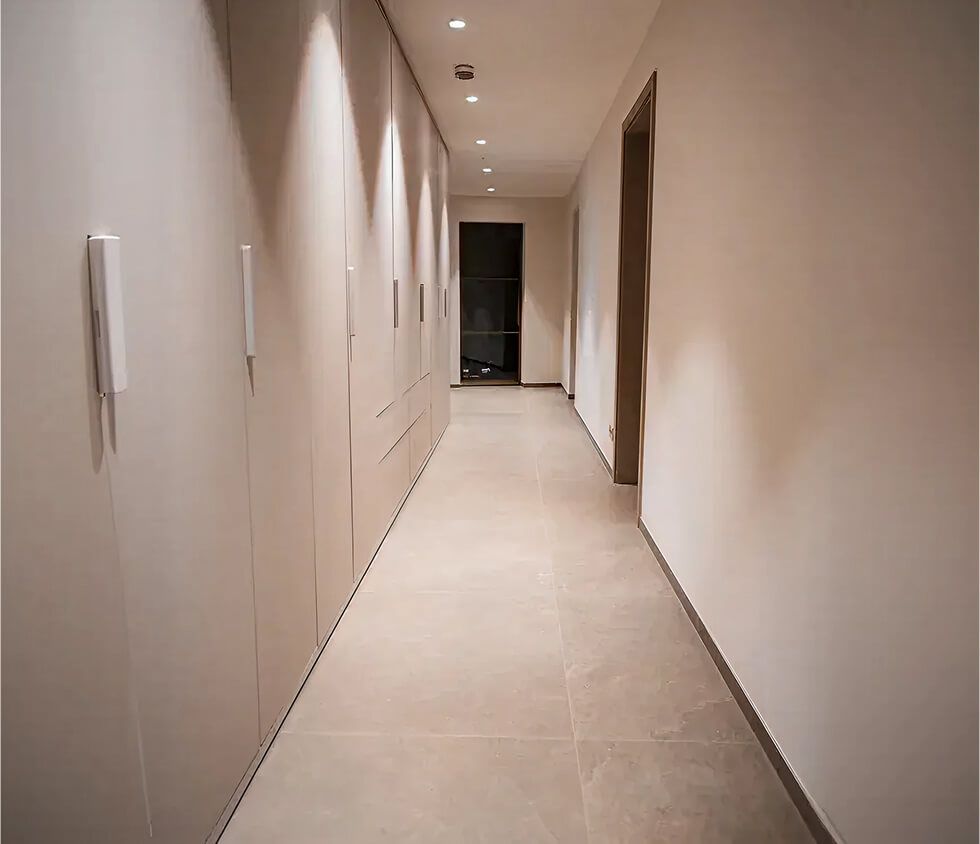 Perfekt darauf abgestimmt sind die maßgefertigten Einbauschränke, die sich flächenbündig in die Architektur einfügen und den Flur zu einem aufgeräumten, funktionalen Stauraumkonzept machen.