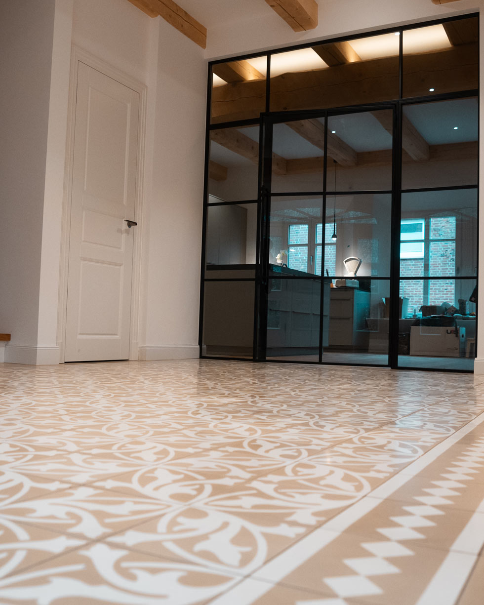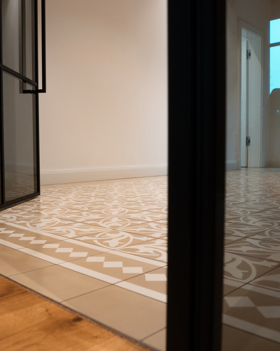 Die eingesetzten Zementfliesen wurden im Eingangsbereich verlegt und bilden dort einen klaren gestalterischen Fokus. Durch ihr geometrisches Muster und die harmonische Farbgebung entsteht eine lebendige, aber ausgewogene Fläche, die den Raum optisch aufwertet und Besucher direkt empfängt.